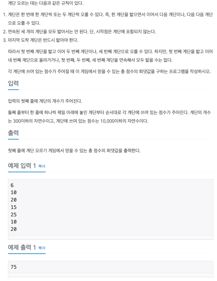 # 계단에 쓰여 있는 점수가 주어질 때 점수의 최댓값 구하기