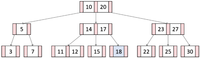 1) 18 검색 시작, 루트 노드 Key 중 10보다 크고 20보다 작기 때문에 중간 자식 노드로 이동