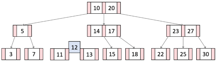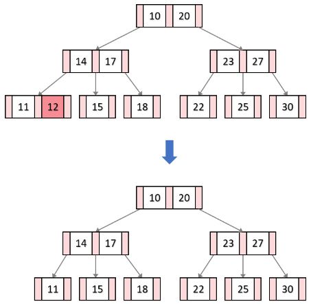 - 12 삭제, 해당 노드의 Key 개수는 최소 Key 개수 1보다 크므로 바로 삭제