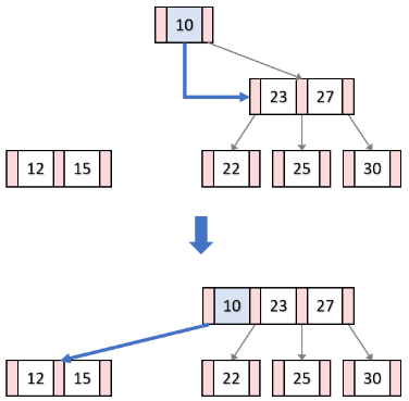 2. 최소 Key 개수 이상의 Key 를 가진 형제 노드가 왼쪽 형제라면 가장 큰 값을, 오른쪽 형제라면 가장 작은 값을 부모 Key 로 대체