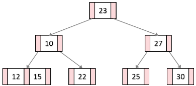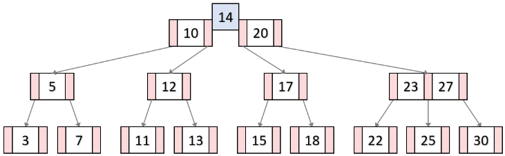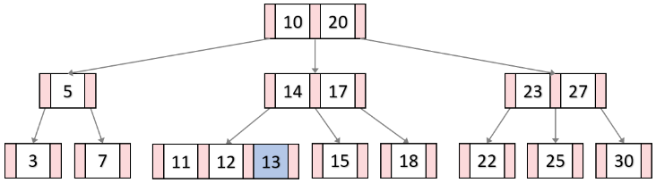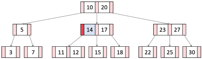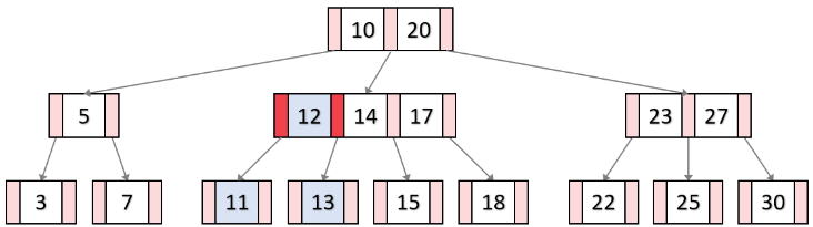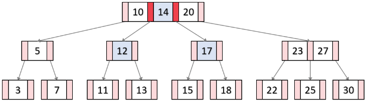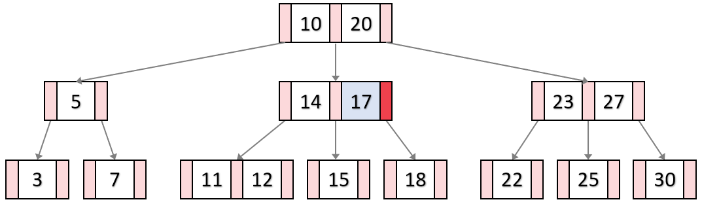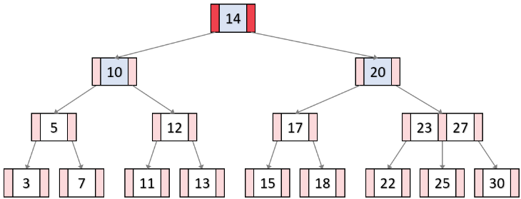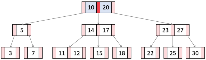 차수가 3인 B-Tree, 파란색 부분은 각 노드의 Key 를 나타내며, 빨간색 부분은 자식 노드들을 가리키는 포인터