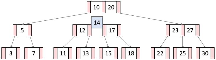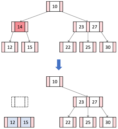 6) 12가 병합된 노드가 최대로 가질 수 있는 Key의 개수를 초과했기 때문에 중앙값 14를 기준으로 분할 수행