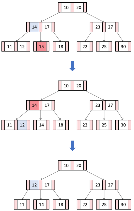 - 15 삭제, 해당 노드를 부모 Key 로 대체, 왼쪽 형제 노드에서 가장 큰 값을 부모 Key 로 대체