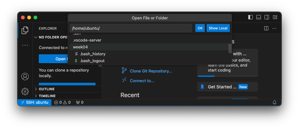 SSH 로 접속 성공하면, Open Folder 선택해서