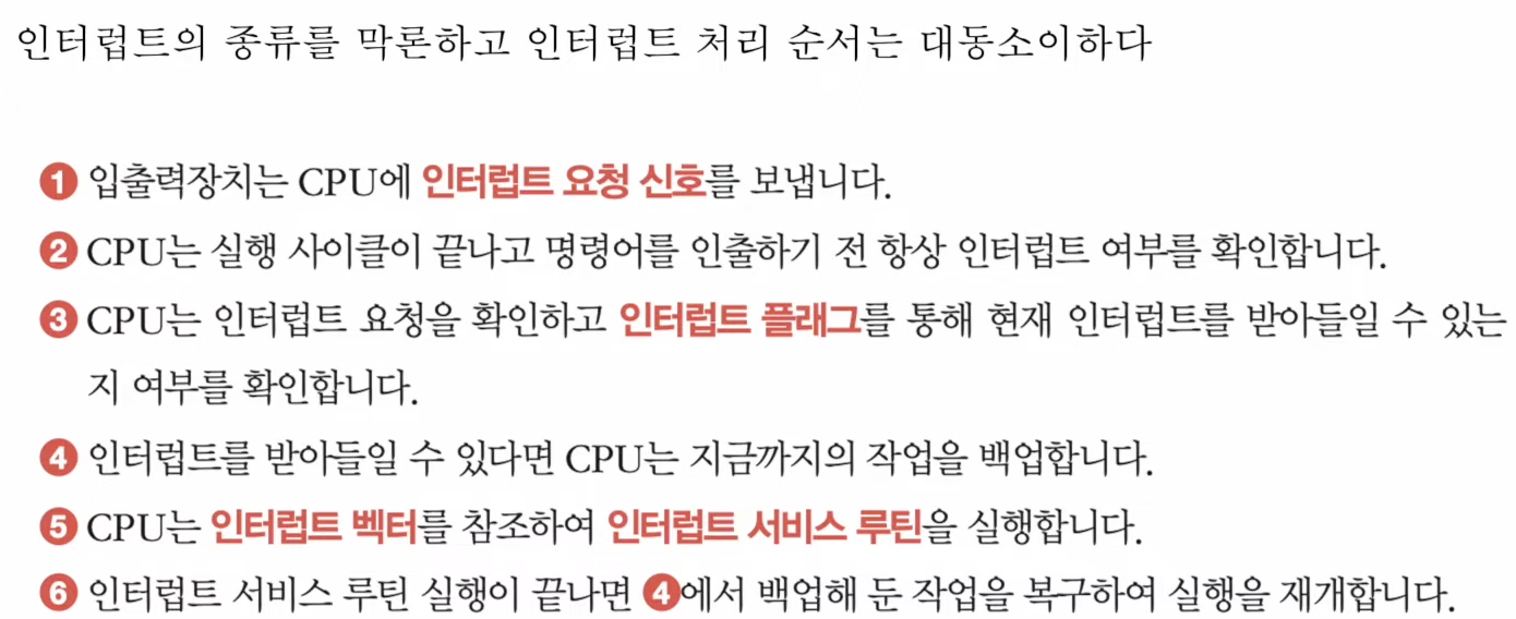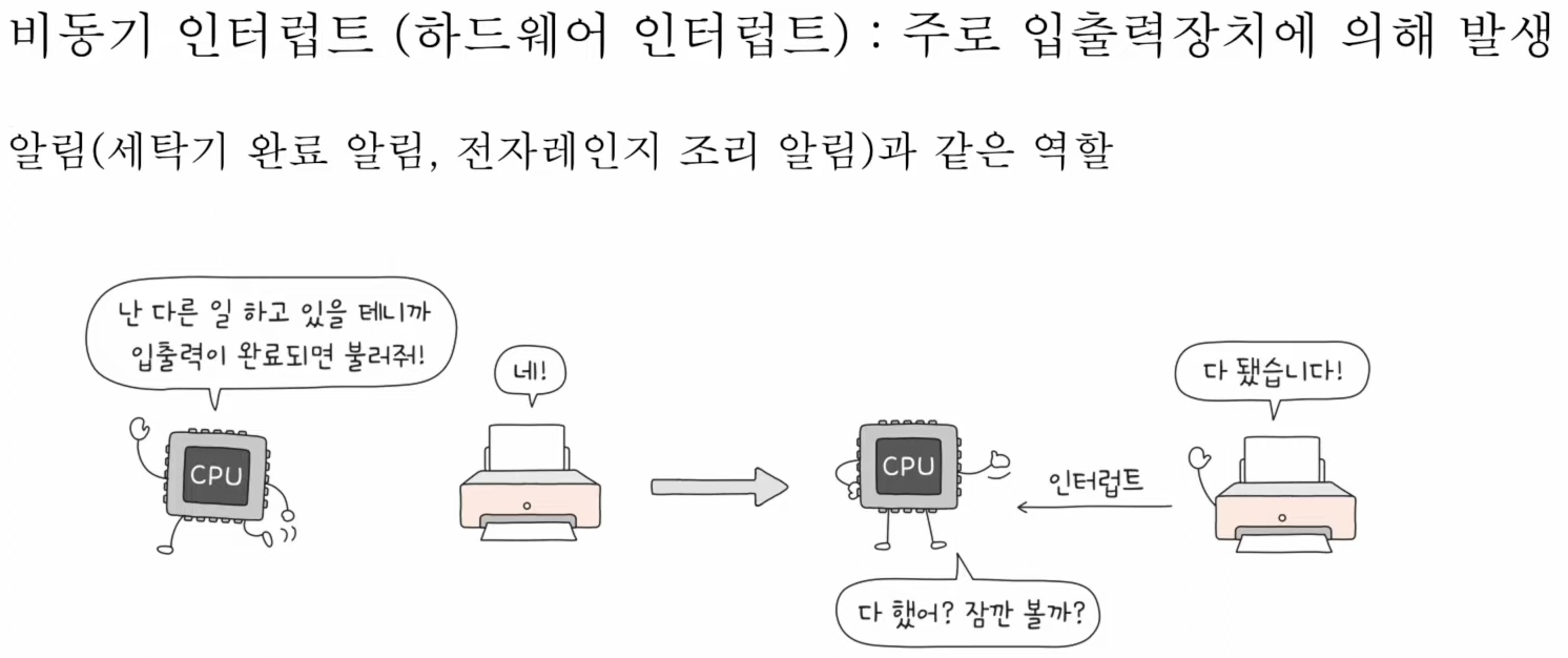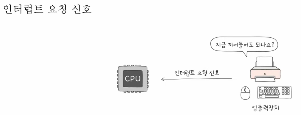 알림과 같은 인터럽트, 입출력 작업 도중에도 효율적으로 명령어를 처리하기 위해 하드웨어 인터럽트 사용