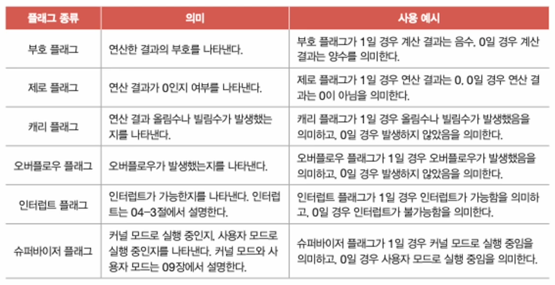 플래그 레지스터에 담기는 정보 - 연산 결과에 대한 부가 정보 (연산 결과 - 음수, 0 등)