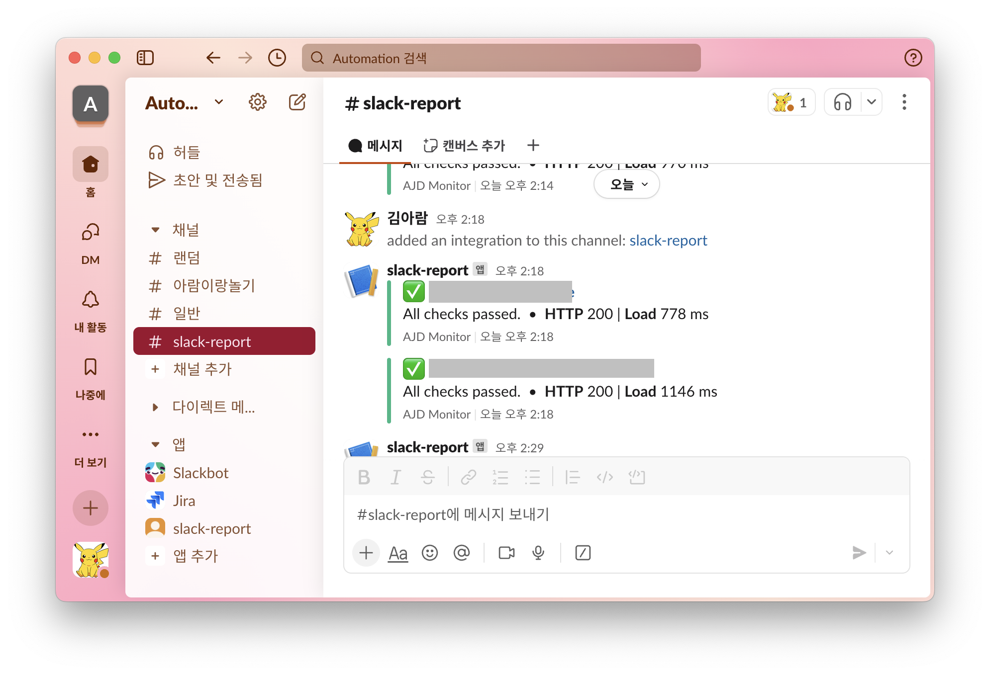 1. Slack 채널 생성 먼저, Slack 에 채널을 하나 만들어준다 2. Slack API 페이지 접속 및 앱 생성 Slack API 페이지에 접속해서 채널에 연동할 앱을 만들어준다 👉 https://api.slack.com/apps Slack API: Applications | SlackYour Apps Don't see an app you're looking for? Sign in to another workspace.api.slack.com 옵션은 Scratch 와 App Manifest 가 있는데, Scratch 를 선택한다 App Name 은 채널 이름 그대로 입력해주고, Workspace 도 선택해준다 3. Incoming Webhooks 활성화Feature > Incoming Webh..