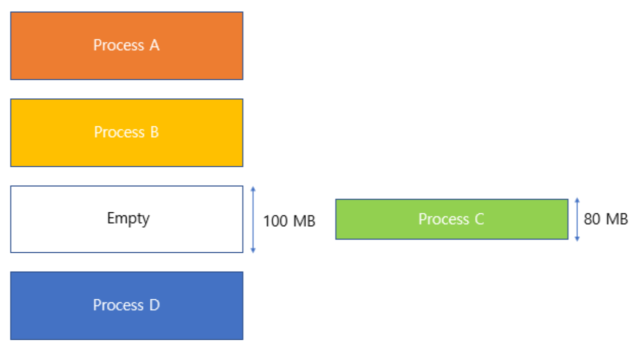 단편화 Fragmentation 기억 장치의 빈 공간 또는 자료가 여러 개의 조각으로 나뉘는 현상 기억 장치의 사용 가능한 공간을 줄이거나, 읽기와 쓰기의 수행 속도를 늦추는 문제점을 야기한다 내부 단편화 할당된 블록이 데이터 자체보다 더 클 때, 할당된 블록 내에서 사용되지 않는 공간이 발생하는 현상 (컴퓨터 시스템 책 CH9.9.4)일정 크기의 페이지에 프로세스 할당 시, 프로세스의 크기가 페이지보다 작을 경우 내부 단편화가 발생한다 외부 단편화전체 가용 블록 공간은 충분하지만, 가용 블록이 여러 조각으로 나뉘어져 단일한 가용 블록은 없는 현상 프로그램이 메모리를 할당받고 종료되면 그 메모리 공간이 해제되는데, 이 공간이 다른 프로그램과 조각나게 되어 빈 공간이 생긴다 외부 단편화는 이전 패턴의 요청..