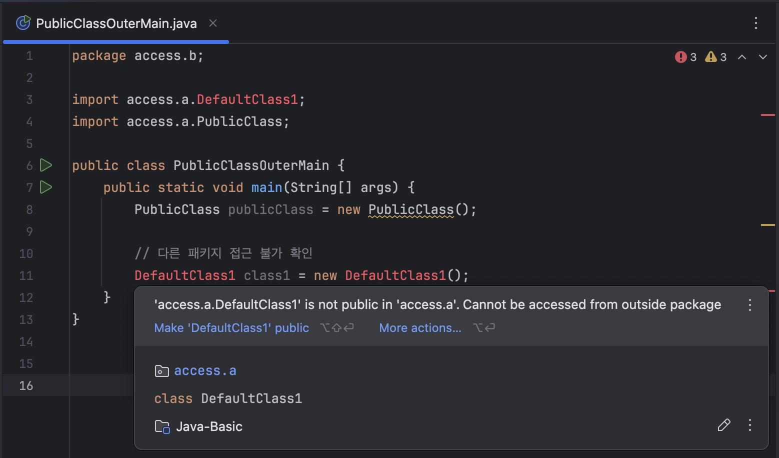 접근 제어자 접근 제어자 이해 자바는 public, private 같은 접근 제어자 Access Modifier 를 제공한다 접근 제어자를 사용하면 해당 클래스에서 특정 필드나 메서드에 접근하는 것을 허용하거나 제한할 수 있다 🐣 다른 클래스에서 접근하지 못하도록 하려면 private 을 앞에 선언해 주면 된다 🐣private 접근 제어자는 모든 외부의 호출을 막기 때문에, 해당 클래스 내부에서만 호출할 수 있다 좋은 프로그램은 적절한 제약을 제공하는 프로그램이다 package access;public class Speaker { private int volume; ...}package access;public class SpeakerMain { public static void main..