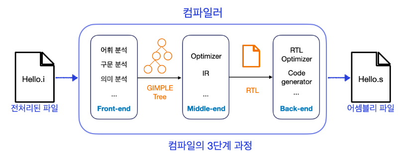 GCC, GNU Complier CollectionGNU 프로젝트의 오픈 소스 컴파일러 모음집 단순한 컴파일 과정을 넘어 전처리 동작, 어셈블 동작, 링킹 동작을 같이 수행해 Binary file, 실행 가능한 파일을 만드는 역할을 한다 GCC 는 Front-End 부터 Back-End 까지 모두 자체적으로 개발해 제공되고 있으며, GPLv3 인증으로 모든 소스가 공개되어져 있다 해당 컴파일러 모음집을 사용할 경우 사용된 소스를 무조건 공개해야 하는 의무를 가지게 된다 GCC 동작 과정1. 전처리 과정 - 전처리기인 cpp0 에 의해 .i 파일 생성2. 컴파일 과정 - C 컴파일러인 cc1 를 통해 .s 파일 생성 3. 어셈블 과정 - 어셈블러인 as 에 의해서 .o 파일 생성 4. 링킹 과정 - 링..